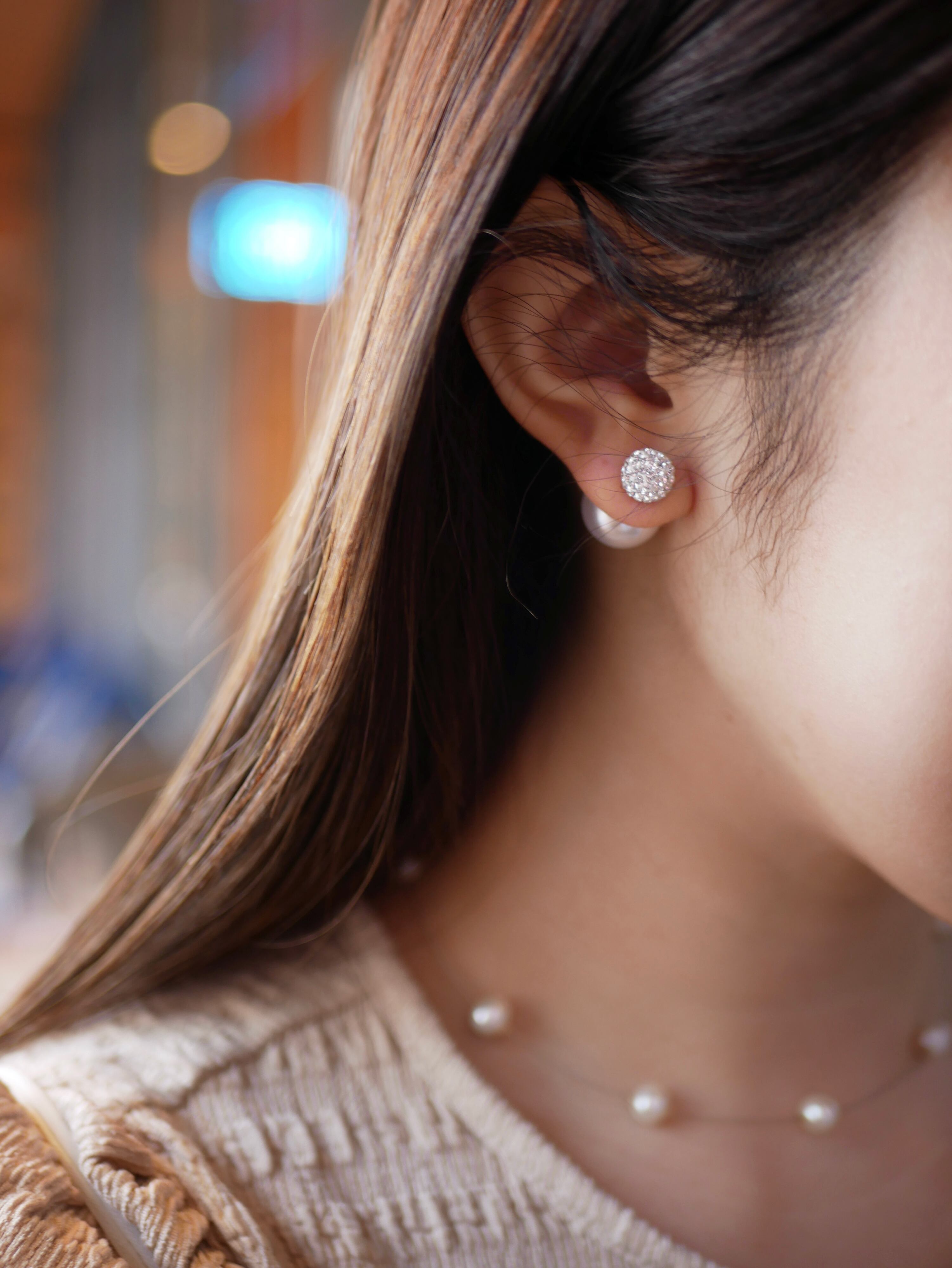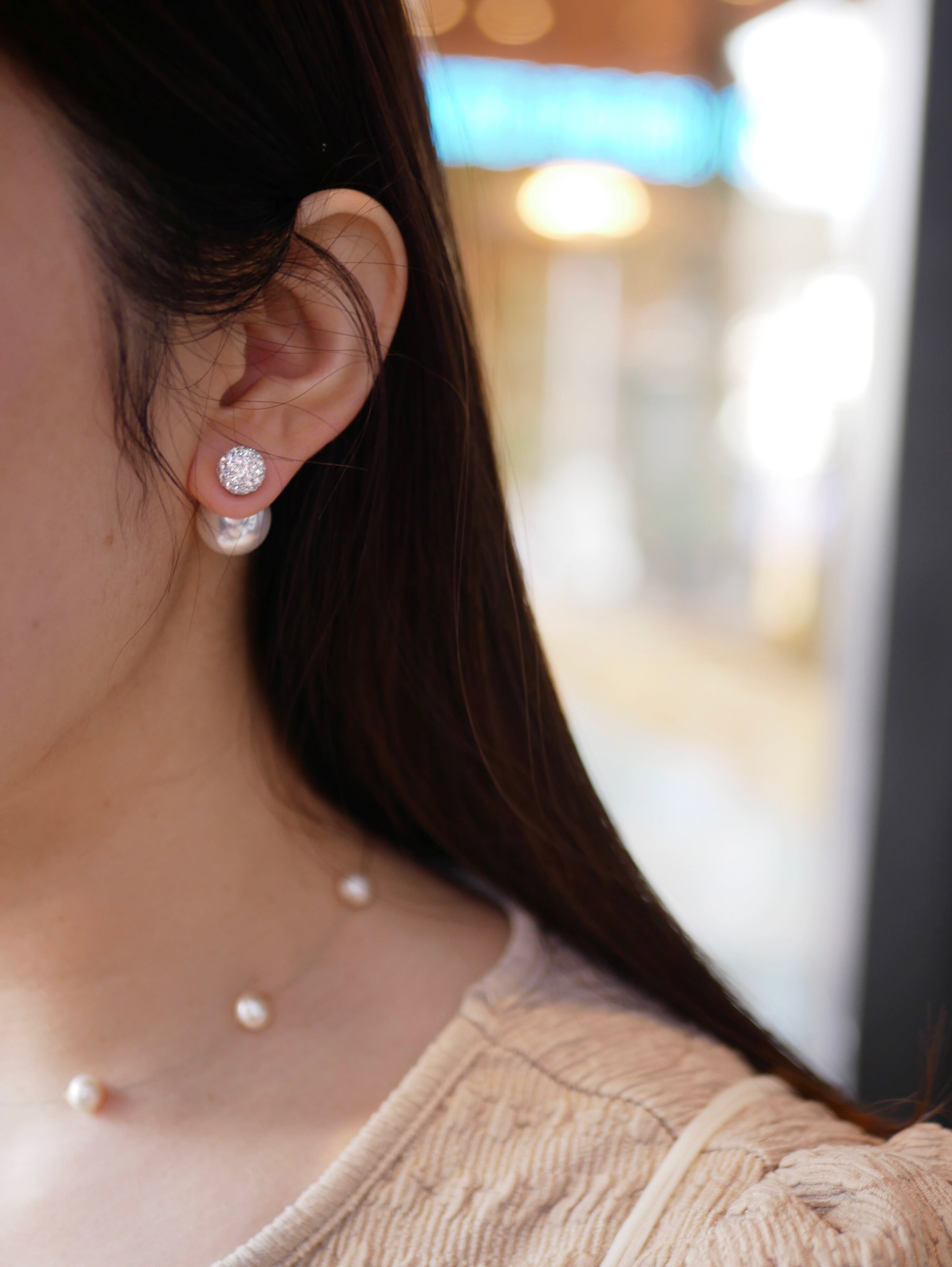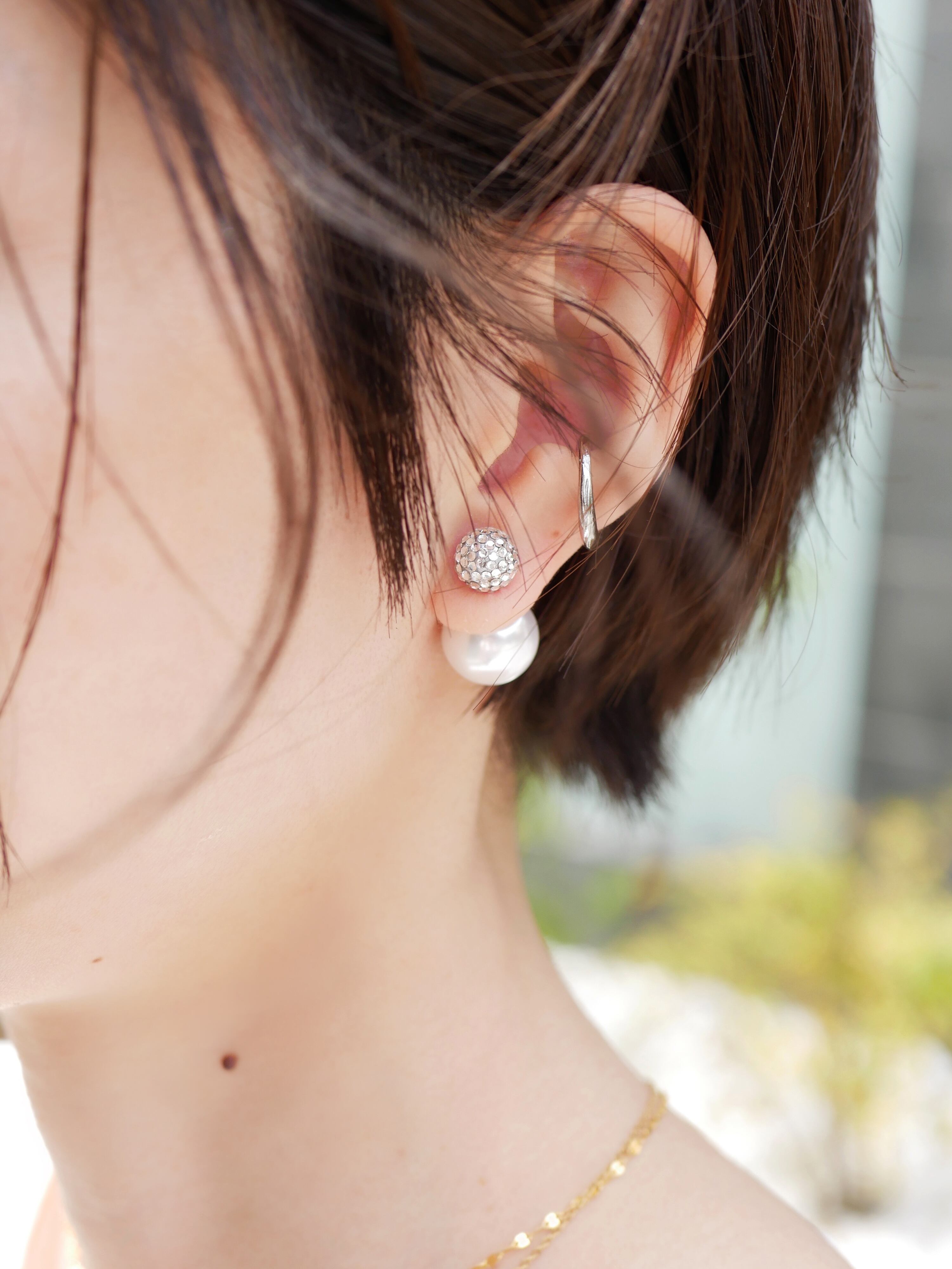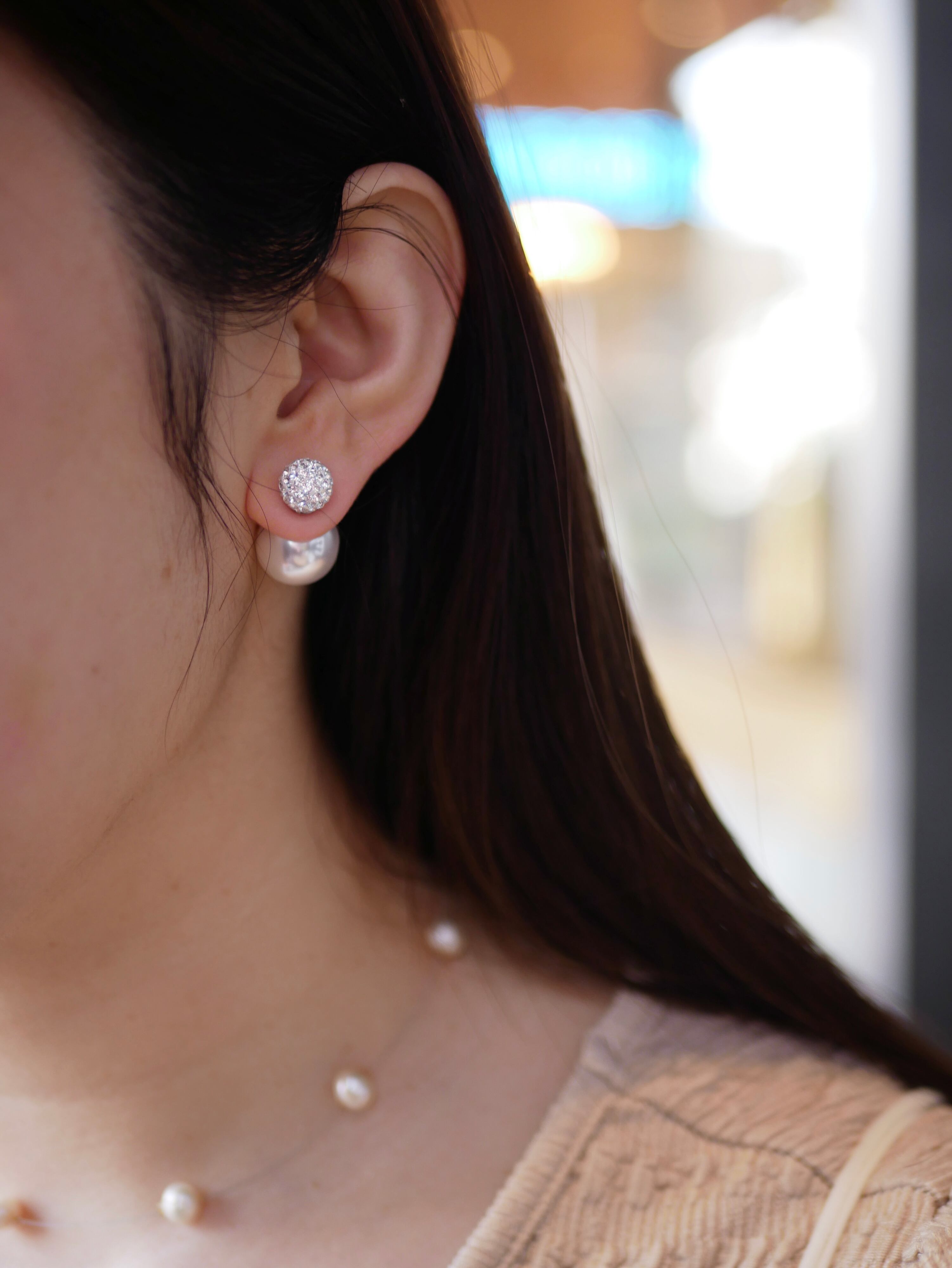 8mmと大き過ぎず小さ過ぎないちょうど良いサイズ感のパヴェボールは、その輝きがしっかりとした存在感を与えるます。キャッチには14mmのパールキャッチを使用。前から見た際にチラリと見えるところも◎ピアス金具はチタンポストを、キャッチの肌に触れる部分はシリコン仕様なので、ご安心して永くご愛用頂きやすいアイテムです。