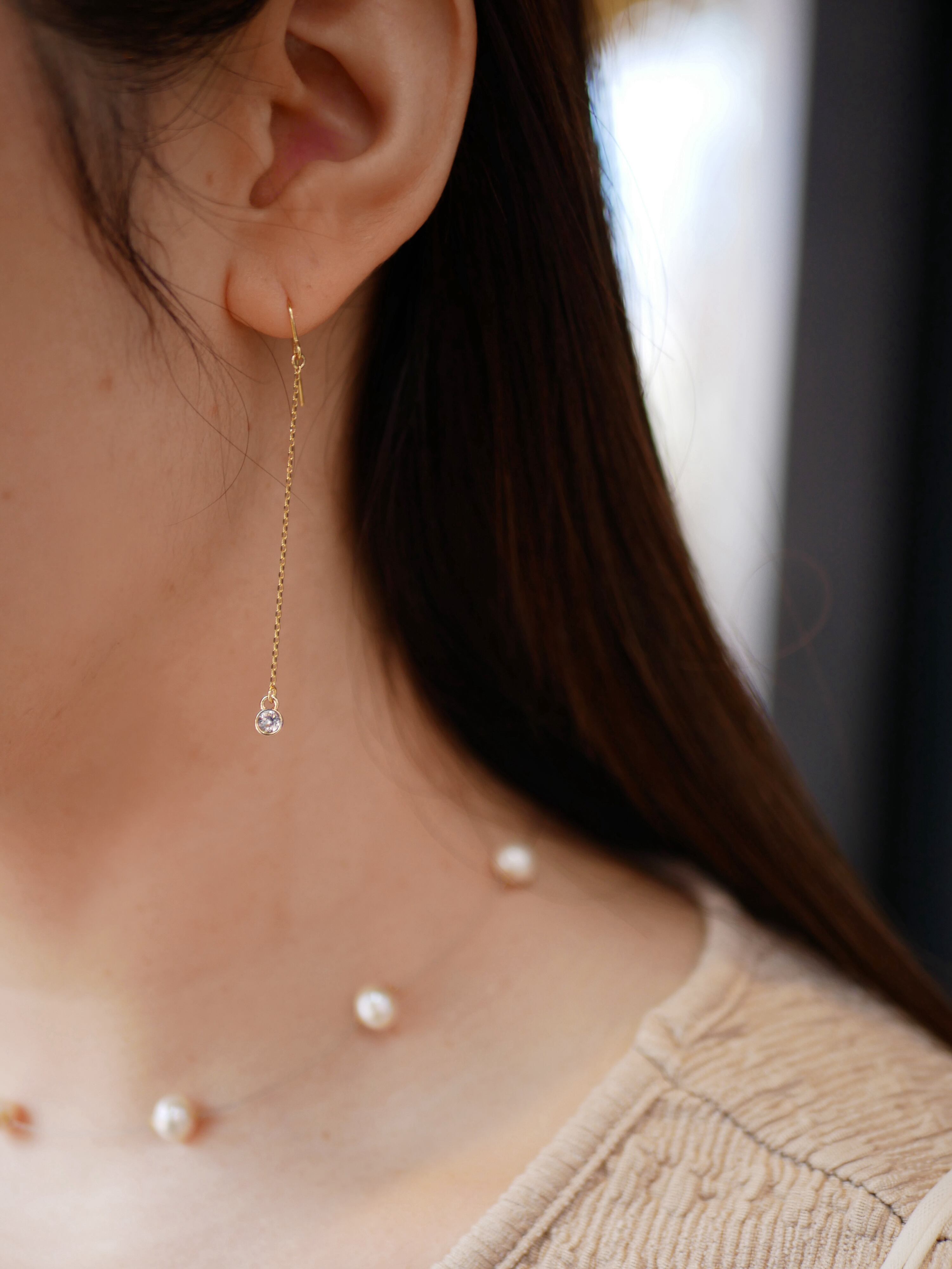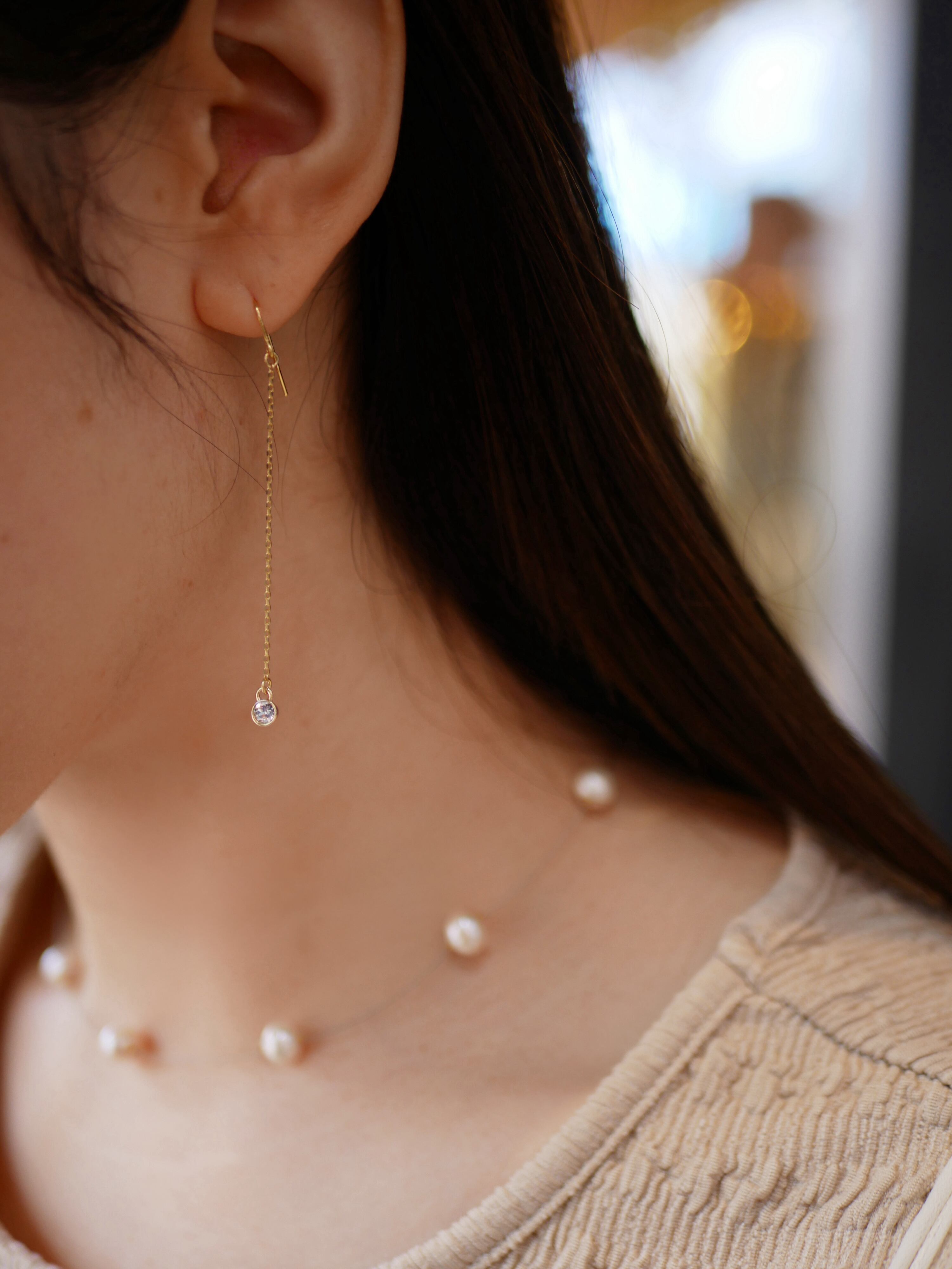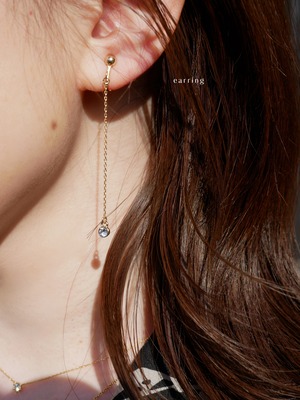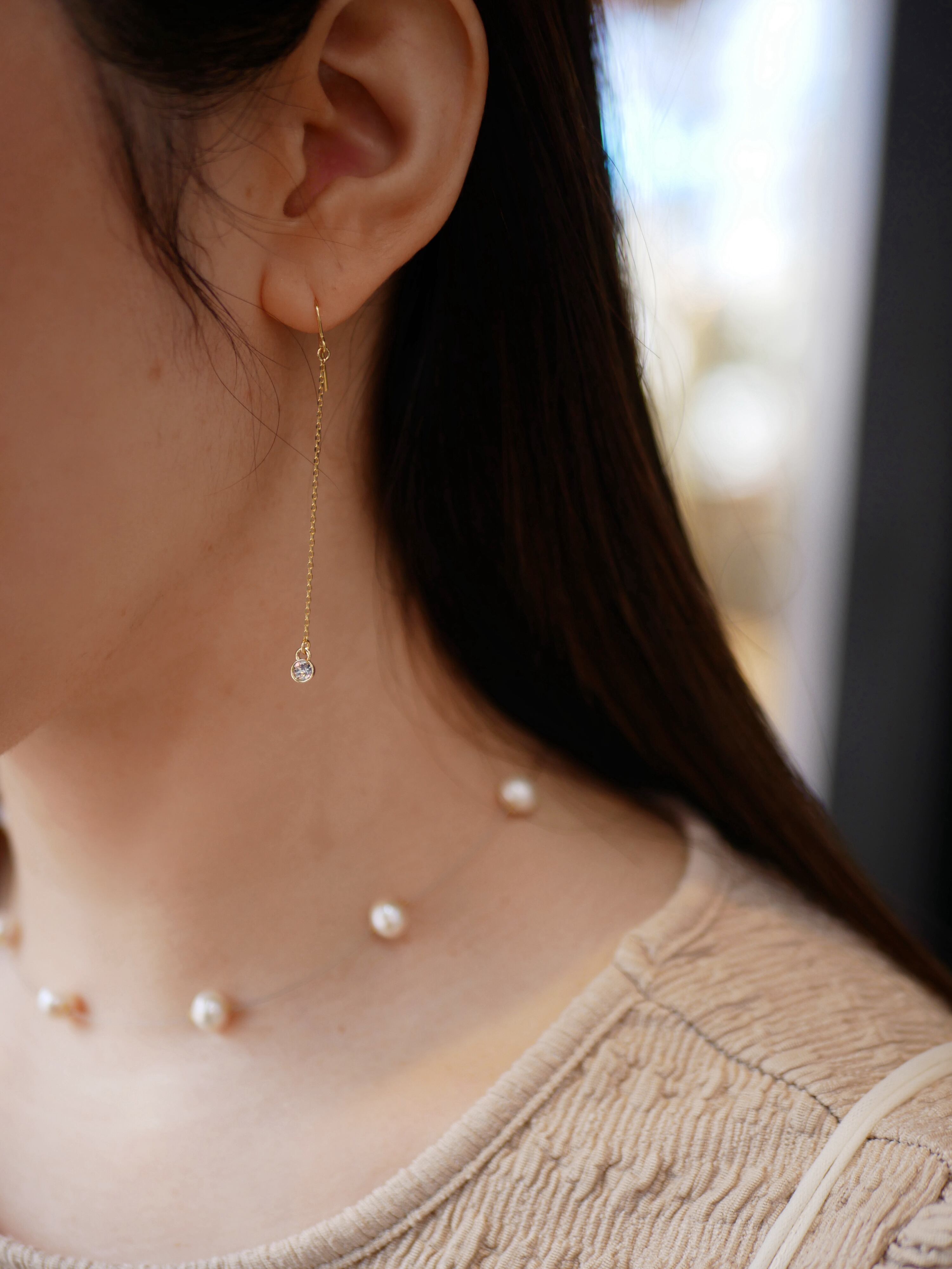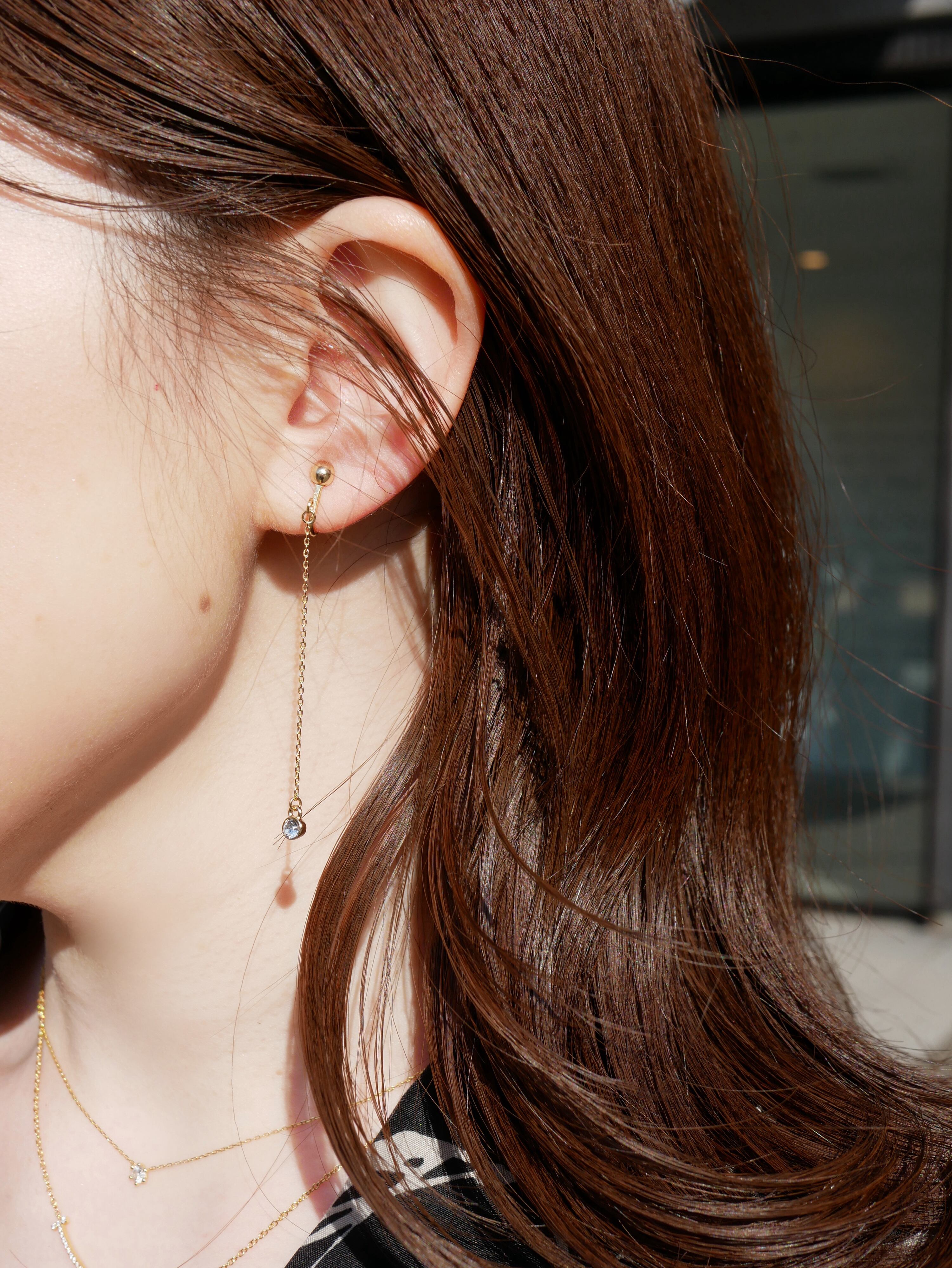 小さめなクリスタルを各1ずつセッティングし、シンプルながらもお顔周りでしっかりと煌めきます。チェーンはカッティングが施された仕様のものを採用し、華奢だからこそ全体に輝きをもたせたデザインに。約6cmと長すぎず短すぎずな長さで、デイリーにご着用いただきやすいアイテムです。